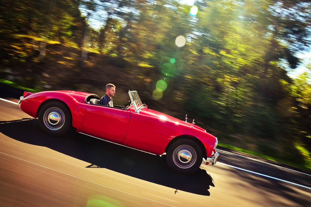 Notre MG A est de 1956 et se présente à vous dans une magnifique livrée rouge framboise, intérieur cuir. Confortable et agréable à conduire, elle vous transportera dans un autre temps. Après un petit temps d’adaptation, vous ne voudrez plus vous en séparer, préparez vos mouchoirs...